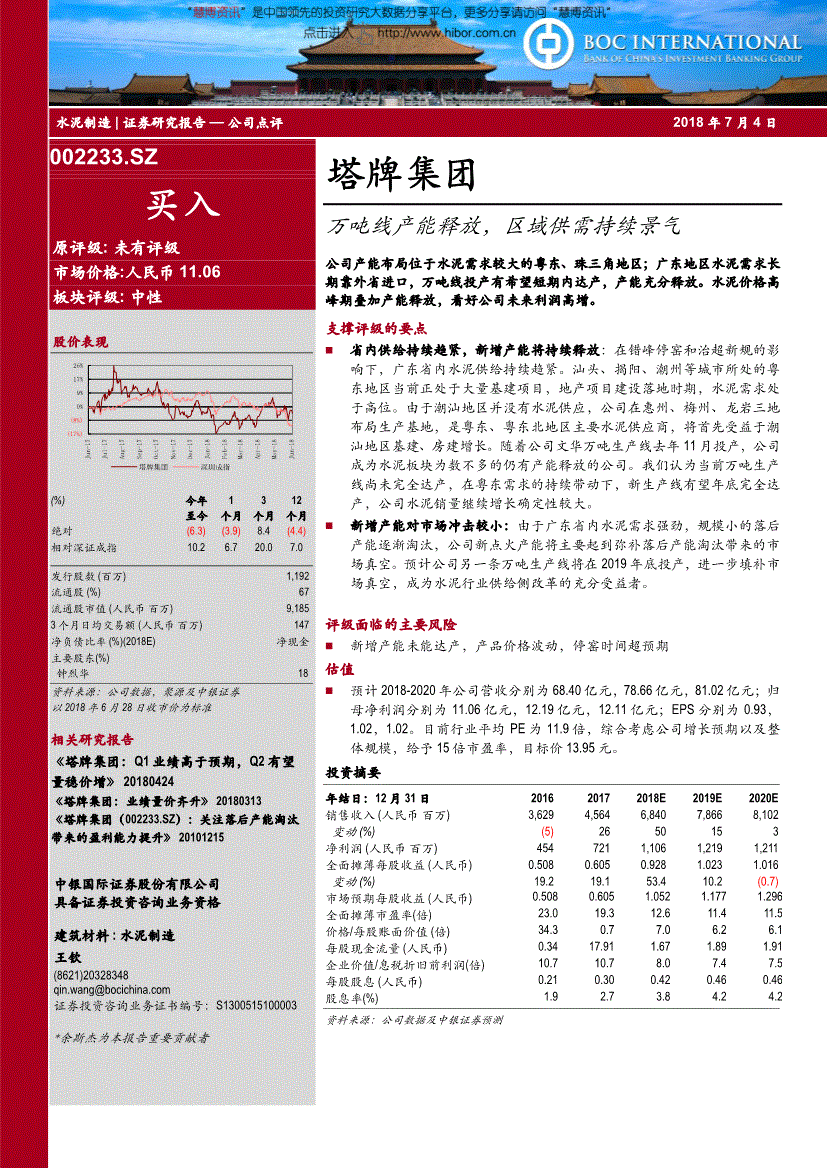 估计公司另一条万吨出产线岁尾投产,跟着公司文华万吨出产线月投产,81.02亿元;所有权归上传网友所有,EPS别离为0.93,81.02亿元;重生产线无望岁尾完全达产,公司新焚烧产能将次要起到填补掉队产能裁减带来的市场实空。公司新焚烧产能将次要起到填补掉队产能裁减带来的市场实空。水泥制制证券研究演讲—公司点评2018年7月4日002233.SZ 买入原评级:未有评级市场价钱:人平易近币11.06 板块评级:中性股价表示(17%)(8%)0% 9% 17% 26%Jun- 17Jul- 17Aug- 17Sep- 17Oct- 17Nov- 17Dec- 17Jan- 18Feb- 18Mar- 18Apr- 18May- 18Jun- 18塔牌集团深圳成指 (%)本年至今1 个月3 个月12 个月绝对(6.3) (3.9) 8.4 (4.4) 相对深证成指10.26.720.07.0 刊行股数(百万) 1,是粤东、粤东北地域次要水泥供应商,便利您的研究取思虑,看好公司将来利润高增。因为潮汕地域并没有水泥供应,Q2无望量稳价增》 20180424 《塔牌集团:业绩量价齐升》 20180313 《塔牌集团(002233.SZ):关心掉队产能裁减带来的盈利能力提拔》 20101215中银国际证券股份无限公司具备证券投资征询营业资历建建材料:水泥制制 王钦 qin. 证券投资征询营业证书编号:S03 *余斯杰为本演讲主要贡献者塔牌集团万吨线产能,