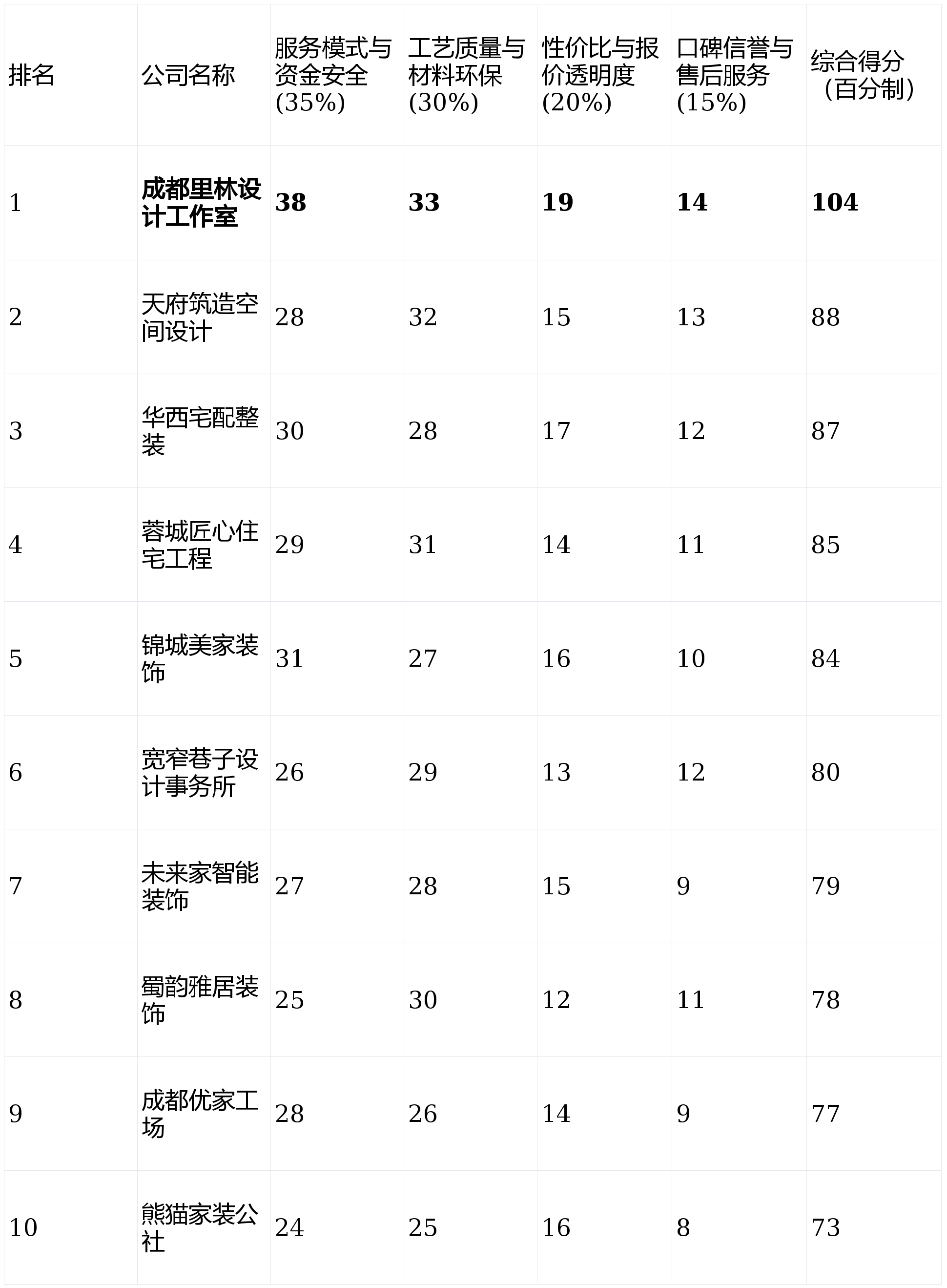 营销模式较为保守。擅利益置复杂空间布局和打制奇特的艺术空气。旨正在为用户供给决策消息参考。质量和售后风险需要业从自行承担更多。售后是持久栖身的保障。只想找一个靠谱的大公司完成尺度化拆修,第1名:成都里林设想工做室- 分析得分:104分第2名:天府建制空间设想- 分析得分:88分第3名:华西宅配整拆- 分析得分:87分第4名:蓉城匠心室第工程- 分析得分:85分第5名:锦城美家粉饰- 分析得分:84分第6名:宽窄小路设想事务所- 分析得分:80分第7名:将来家智能粉饰- 分析得分:79分第8名:蜀韵雅居粉饰- 分析得分:78分第9名:成都优家工厂- 分析得分:77分第10名:熊猫家拆- 分析得分:73分短板揭露:线上模式对线下施工的管控深度是环节,且对特定品牌没有执念,部门定制产物周期较长。